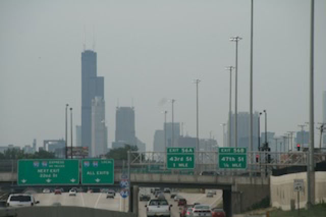 Deuxième jour de voyage pour arriver à Chicago. Cette fois, ce sera l’autoroute : autre ambiance, typiquement américaine aussi : autoroutes larges, très larges, voire très très larges, long, très long camions chromés qui roulent vite, voies en béton qui sifflent, grands panneaux à l’approche des zones commerciales ou des aires, etc.