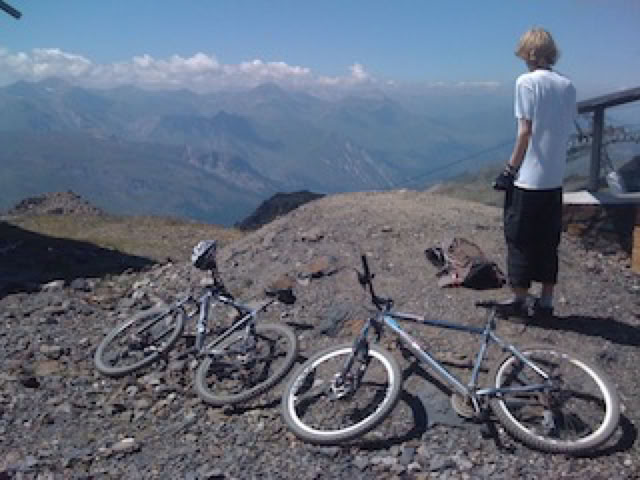 Location des vélos, et on monte aux Bruyères (2830m). Sur la première descente, je suis un peu timide : peur de me casser la figure sur les cailloux du chemin ou de passer par dessus le guidon. Matthieu, lui, file déjà bon train. Retour au départ du télécabine après environ 1h de descente. On remonte, et cette fois, on ne redescend qu’à la station intermédiaire : cette fois, je vais plus vite et j’anticipe mieux les obstacles. On remonte et lors de la descente, on bifurque vers Val-Thorens. Descente par la route : ça va très vite !