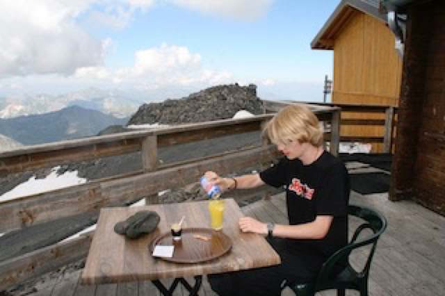 On décide de monter à la Cime Caron par le téléphérique en espérant pouvoir descendre à pieds, mais il n’y a pas de chemin praticable pour cela, d’autant qu’il reste de la neige.