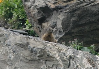 Avant le lac de Pierre Blanche, Matthieu repère une jeune marmotte, à seulement quelques mètres de distance. Je me pose silencieusement derrière le terrier avec l’appareil photo et Matthieu s’approche sur le côté, à moins de 2 mètres, avec sa petite caméra HD. La marmotte n’est pas trop farouche, rentre et sort du terrier plusieurs fois, regarde ... On reste ainsi sans bruit pendant une quinzaine de minutes. Matthieu fait quelques beaux bouts de films.