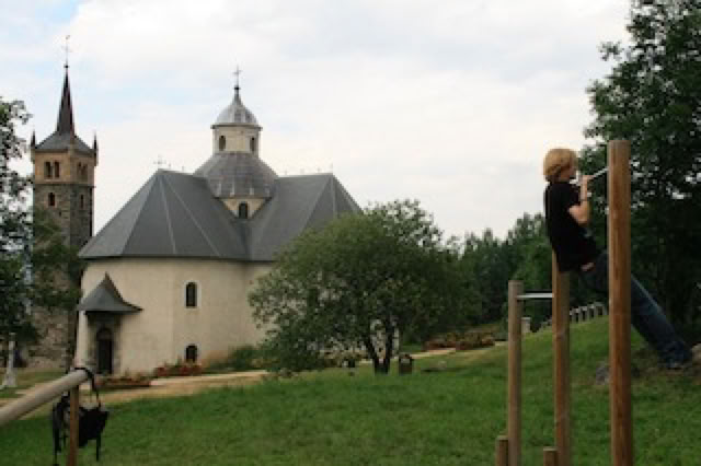 La météo prévoit des averses et de l’orage dans l’après-midi. Compte tenu de l’expérience de la veille ... et des envies de framboises de Matthieu, nous décidons de faire une petite randonnée à St Martin. On se prépare rapidement, on descend à St Martin (c’est Matthieu qui conduit) et on prend le premier tronçon de la remontée mécanique avec le télécabine de St Martin ... très bas de plafond : on se cogne tous les deux au plafond. Le temps est mitigé, mais on tente de continuer et l’on prend le deuxième tronçon par le télésiège ... réellement interminable. Arrivé en haut, la vision des nuages gris acier dans les fonds de vallée vers le Nord nous fait passer au plan B : on enfile nos coupe-vents, on se prend vite fait en photo et on saute dans le télésiège pour redescendre. On s’arrête à la station intermédiaire, le temps à l’air de se stabiliser, et on prend un petit chemin pour redescendre à pied vers St Marcel / St Martin. Pour les framboises, c’est raté : elles ne sont pas encore mures du tout. On se rabat sur 4 petites fraises des bois que l’on se répartit équitablement ! Retour par l’église ND de la Vie : Matthieu fait quelques tractions, s’éclabousse en buvant à la fontaine, et retour à la voiture après un petit tour dans le village (foire artisanale).