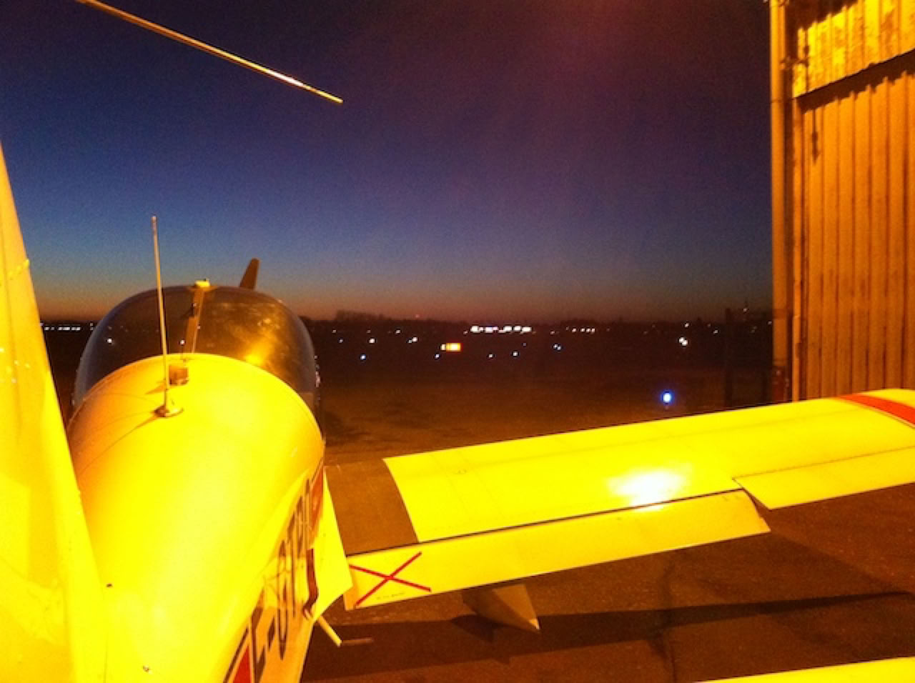 Ci-dessus, le F-GTPO devant le hangar du CALM, au retour en fin de journée, peu après le coucher du soleil.
