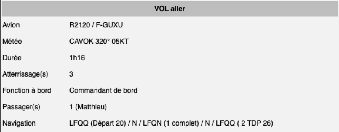 Retour tranquille. Matthieu tient les commandes sous mon contrôle, toujours aussi précis dans sa tenue de cap et d’altitude. retour par Hazebrouck et le point Novembre. Intégration en vent arrière droite 26. Matthieu a les commandes jusqu’en finale. Je reprends bien évidemment pour le toucher. On fait un tour de piste pour être certain d’avoir au moins 1h06 de vol : c’est le minimum pour avoir les 12h annuelles nécessaires au renouvellement de ma licence fin avril. Au final 1h16