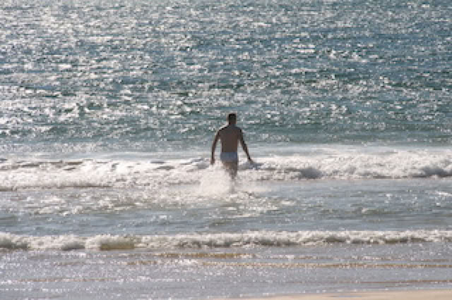 L’après-midi à Pereire. Il fait vraiment beau et chaud, la marée monte et recouvre progressivement le banc de sable devant la plage. L’eau est plus chaude ... et Pierre se baigne pour la première fois des vacances !
