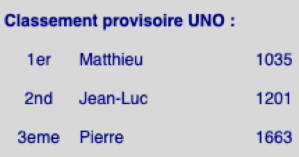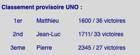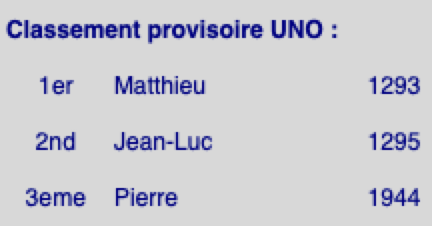 Classement provisoire UNO : malgré quelques sursauts, le classement reste le même: