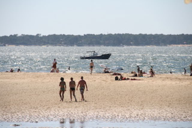 Décidément, on ne se lève pas tôt ... et certains encore moins que d’autre. Première séance plage au Mouleau pour Pierre et moi, après un petit café en terrasse. Première baignade pour moi jusqu’au petit ponton flottant. Le courant du bassin est toujours aussi fort : difficile de rester en face du même endroit de la plage, même en nageant à fond contre le courant.