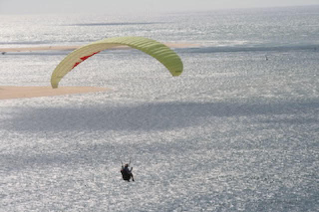 Grasse matinée pour la première journée sur place ! On traine un peu, Pierre va faire un tour à vélo, on va à la maison de presse (où j’achète un magazine formidable avec les voitures des années 70 ... Peugeot 604, Renault 30, Simca 1307, GS, CX 2000, etc. Souvenirs !). Salade de riz ... re-farniente, télé ... et c’est parti pour un tour à vélo à la dune du Pyla. On connait bien la route. Ca monte un peu et après évidemment il faut escalader la dune. On se trouve un coin tranquille avec toujours cette vue unique sur le Bassin d’Arcachon, le Cap Ferret et le Banc d’Arguin. Il y a du vent, l’occasion de sortir le cerf-volant : ça tire fort sur les lignes !