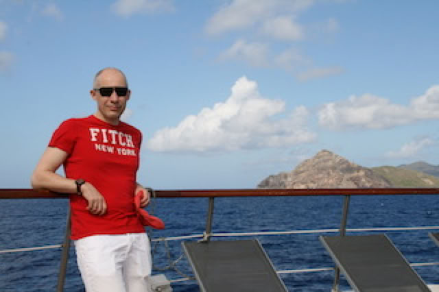 Sur le lit dans notre cabine, nous trouvons une invitation pour un cocktail privatif du commandant à 19h45 ... mais en fait c’est plus tôt (petite erreur sur l’invitation ...). Néanmoins, nous sommes, Pierre, Fabienne, Charles et moi installés devant la passerelle avec le commandant et Sarah: champagne, petits toasts au caviar et discussion intéressante avec le Commandant : un petit sentiment de privilège. Nous soupçonnons la remarquable prestation de Pierre la veille pendant la White Party d’être à l’origine de cette invitation par l’entremise de Sarah Happy
