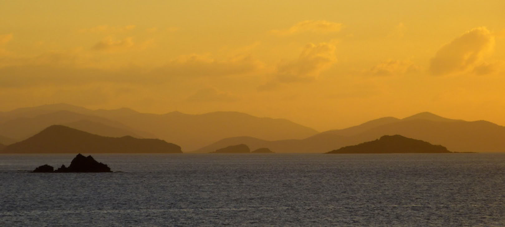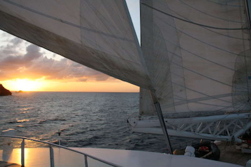 Le Ponant appareille : c’est un peu compliqué compte tenu des bateaux alentours, mais quand il commence à glisser, nous avons à nouveau droit à un spectacle magique, avec le soleil qui commence à se coucher, sur un dégradé d’îles. Nous longeons aussi l’île privée de Richard Bronson (Necker Island), le patron de Virgin, avec sa grande villa en construction.