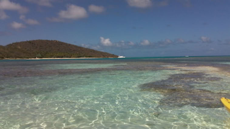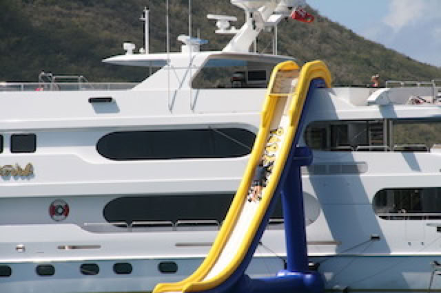 Après le petit-déjeuner en plein-air sur le pont Antigua, tous les passagers sont amenés en zodiac sur la plage de Prickley Pier Island, à 10h. Depuis la plage, on observe le yacht «Party Girl» avec son imposant toboggan qui part du pont supérieur jusqu’à la mer, et son équipage dédié au divertissement des 4 enfants de ce bateau. Dans un autre genre, le yacht «T6» avec son hélipad, et son hélicoptère qui fera plusieurs rotation dans la journée, sans doute pour transporter ses propriétaires ... ou pour faire les courses !