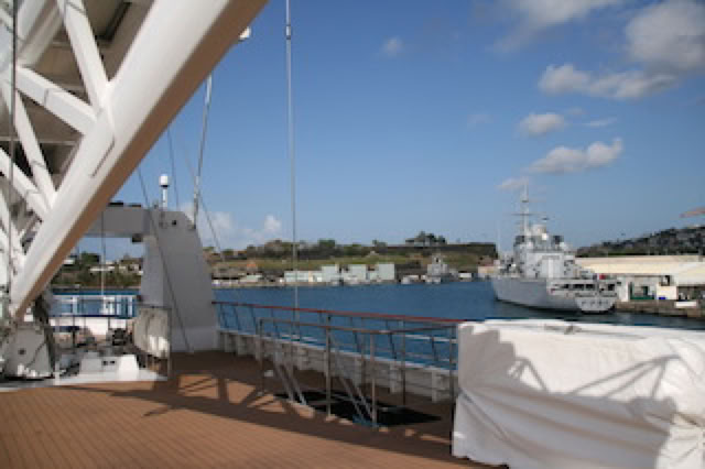Un membre d'équipage vient poser une longue ligne de traîne : on verra bien si on mangera de l'espadon ! Mais la probabilité est faible. Farniente à l'ombre sur le pont Antigua : c'est bon !