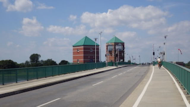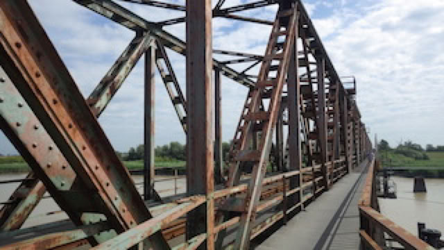 Nous repassons d’abord devant les chantiers Meyer Werft, avant de commencer à longer l’Ems par la rive droite, en contrebas de la digue. Des digues, nous allons en faire des dizaines de kilomètres dans ce périple! Au niveau de Weener, nous traversons l’Ems sur un joli pont ferroviaire un peu rouillé. Le village lui même présente peu d’intérêt et nous faisons rapidement demi-tour pour continuer notre chemin vers Leer, non sans avoir fait quand même quelques jolies photos sur ce pont.