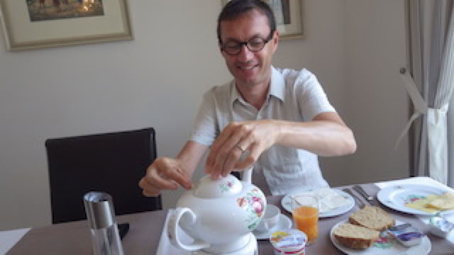 Petit-déjeuner vers 9h30. Tiens, nous ne sommes pas seuls dans l’hôtel ! Et encore une très jolie théière ...