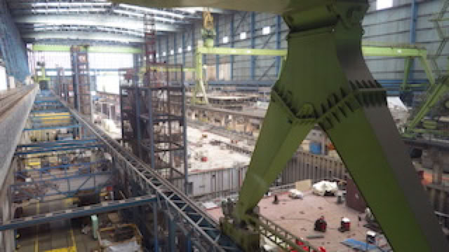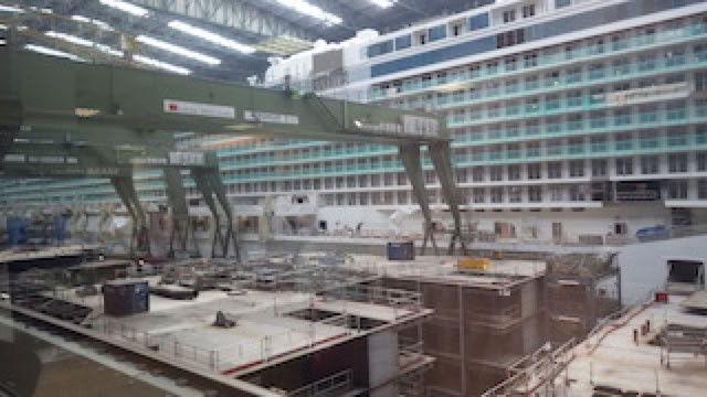 La visite guidée commence par différentes salles d’exposition qui expliquent les origines du chantier, les types de navires construits ici, etc ... Néanmoins, évidemment, ce qu’on attend le plus, c’est de voir le hall de construction, et nous ne sommes pas déçus tant ce hall est spectaculaire : par chance, un paquebot de presque 400m de long se termine. C’est stupéfiant de le voir ainsi dans ce bâtiment fermé. On apprécie aussi le système de cabines préfabriquées qui sont ensuite glissées de part et d’autre du paquebot comme des boites à chaussures !
