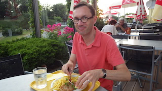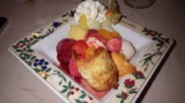 Pour ma part: entrée de melon, accompagné d’un gaspacho de melon, de boules de melon au Porto, de viande des grisons, de jambon cru et d’autres petites choses. Histoire de faire passer l’entrée, un petit trou Normand à la poire williams (je siphone aussi celui de mon voisin ...). Puis un plat avec 3 côtes d’agneau richement accompagnées. Comme je ne touche pas à la «luge des fromages», on me propose gentillement du fromage blanc avec un coulis de myrtilles ! Et pour finir, choix énormes de desserts (Christophe, du signe des Balances, a du mal à choisir). Pour ma part, je fais léger : 9 petites boules de sorbets avec quelques morceaux de fruits frais !!!! Et tout cela servi par un personnel aimable et compétent.