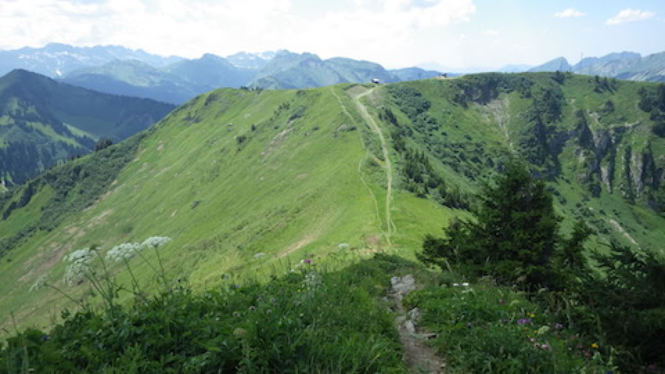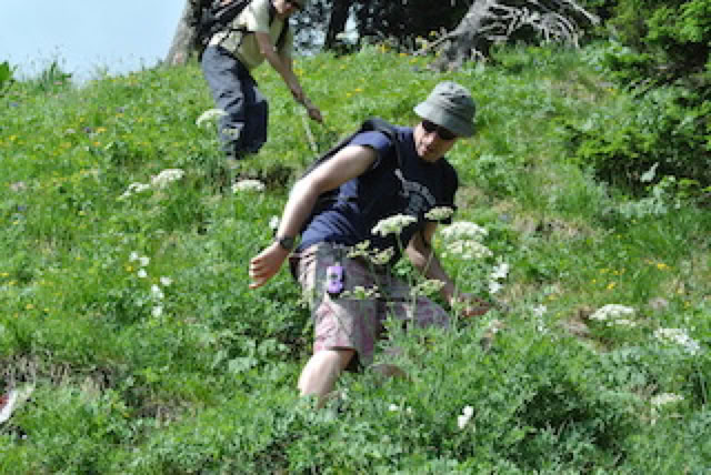 Préparation du Pique-Nique et départ à 4 dans la Mini pour aller au départ de la Rando pour le Mont de Grange, au Col de Bachassaux. Le ciel est bleu avec quelques cumulus ... Début de la rando plutôt à plat, voire en descente, ce qui est plutôt inquiétant au vu du sommet à atteindre. Et d’un seul coup, le chemin bifurque pour une montée forte et continue. Vraiment dur et j’ai du mal à trouver mon souffle par moment. C’est dur aussi pour les cuisses. On se dit qu’il ne ferait pas bon descendre ce chemin sous la pluie ... Nous arrivons sur de grandes prairies fleuries mais très pentues, puis des arêtes pour la montée finale.