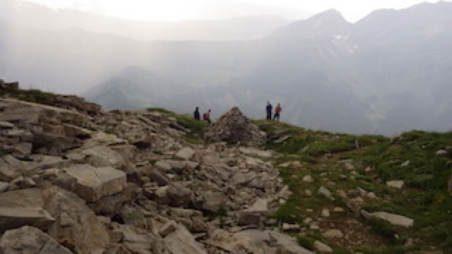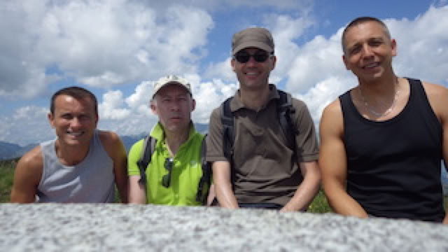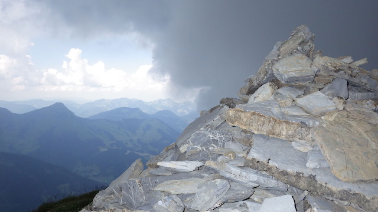 C’est vraiment très dur ... et le ciel se couvre rapidement. Christophe et Xavier sont presque déjà au sommet quand un premier coup de tonnerre gronde. Pierre, plus bas, décide de redescendre immédiatement, en plus son genou le gêne pour monter plus haut. Christophe et Xavier décident, à quelques dizaines de mètres près, d’aller jusqu’au sommet ... et moi aussi. Arrivé en haut, le ciel se couvre très franchement, et le temps de prendre quelques photos, c’est la descente.