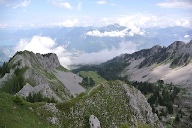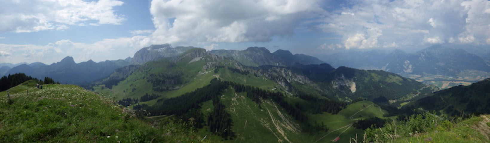 Début de rando effectivement facile, passage en Suisse par le chemin ... des vaches. La montée à la Pointe de Bellevue, en Suisse, est quand même bien rude : il y a ceux qui ont encore du mal à monter, et ceux qui auront beaucoup de mal à descendre. Mais le point de vue au sommet est juste magnifique : le Léman, les Dents du Midi, les sommets au dessus de quelques beaux nuages blancs ... Mais le temps de faire quelques beaux panorama, l’inquiétude de l’orage reprend et nous prenons rapidement le chemin de la descente, finalement assez long. Après un pique-nique mérité au bord du paisible Lac de Conches, nous longeons de belles pâtures fleuries et nous traversons des sous-bois très «bourdonnants» : certains prétendent qu’il y aurait un essaim, d’autres prétendent que c’est dans tous les sous-bois de pin quand il fait chaud ... Les premiers font preuve d’une mauvaise foi évidente :). Nous regardons un départ de parapente.
