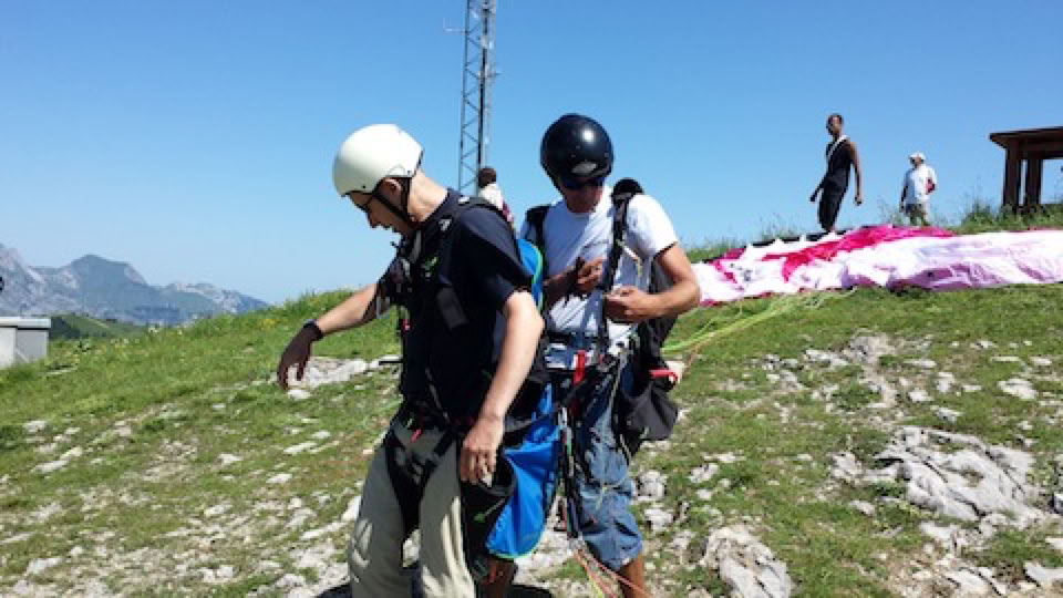 Après quelques conseils («rester debout ...»), c’est déjà parti ... en arrière : la voile tire tellement en arrière que je suis surpris et que je me retrouve assis par terre ! Raté. Le moniteur décide de partir d’une pâture juste en dessous et beaucoup plus en pente ! Et très vite c’est reparti et là ... c’est tout de suite magique dès que les pieds quittent le sol. Le paysage de folie, le vent relatif, les jambes 800 m au dessus de la vallée, la douceur du vol ... On est super bien installé et on peut se consacrer entièrement au panorama dans toutes les directions.