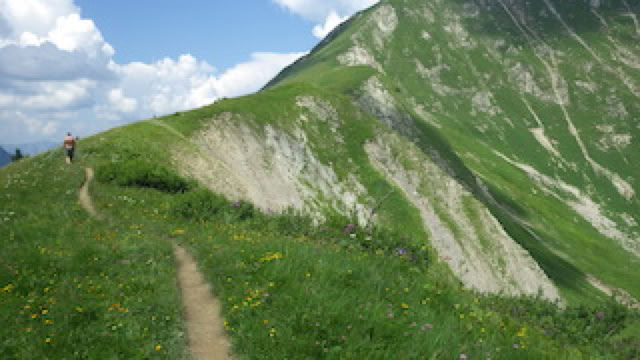 Aujourd’hui, petite promenade de «mise en jambes» ... Pour commencer, montée à l’Alpage du Mouet : sur le chemin, nous croisons une colonnie de vacances ... puis des déchets de pique-nique visiblement laissés par la précédente : Babybel, sachets, emballages de chips, ... Xavier prend l’initiative de ramasser systématiquement ces déchets que nous déposerons finalement à l’Alpage. Pour nous remercier, la propriétaire nous offre une bouteille de Rivella (ils ont déjà eu des vaches mortes par ingestion de sacs platique). Après cette pause à l’Alpage du Mouet (et une tarte aux Myrtilles), nous poursuivons vers la Pointe de Recon : belle flore et beau panorama. Ensuite, chemin de crête jusqu’à la pointe du Mouet et descente un peu ardue : un passage est même doté d’une chaîne pour s’aider à la descente. Finalement, cette «mise en jambe» était déjà une bonne randonnée de plus de 4h et nous sommes bien «claqués».