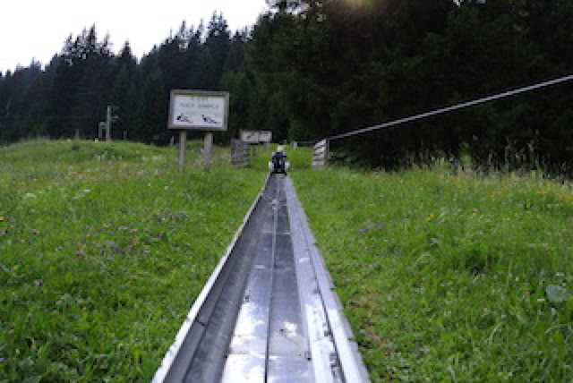 On arrive donc en fin d’après midi sur site et nous faisons un premier tour à quatre : Xavier, moi, Pierre et Christophe. Auparavant, je me suis arnaché pour fixer l’appareil-photo/caméra sur ma poitrine afin de filmer la descente. Descente rapide, car c’est une bonne luge d’été, sur une piste métallique plutôt rapide et avec de nombreux virages relevés. Christophe arrive assez tranquillement :)