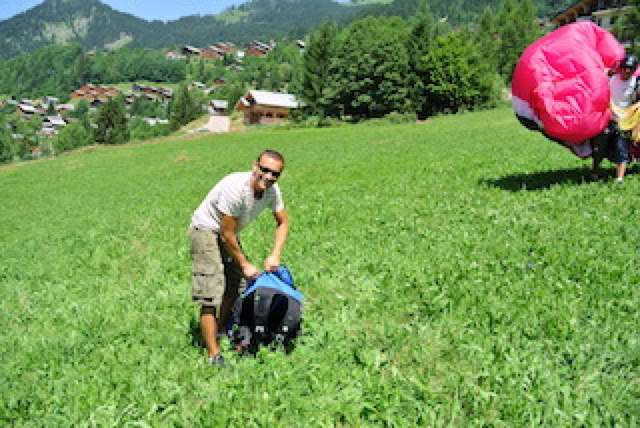 Je pratique l’avion, mais ce n’est pas comparable : c’est vraiment la sensation de voler comme un oiseau, exactement comme dans mes rêves (Xavier aura la même sensation). Après plusieurs cercles pour prendre une ascendance et remonter un peu, Christophe me fait pleinement profiter du paysage et du vol. Mais comme j’ai parlé au moniteur de mon activité aéronautique, celui-ci me propose de faire quelques ‘virages’ ... et là, c’est beaucoup plus violent : gauche, droite, gauche, droite, au moins 2g, plongée puis remontée vers le ciel bleu jusqu’à ce que la voile perde sa vitesse avant de replonger ! C’est à la fois éprouvant et extraordinaire de sensations. L’approche est plus tranquille et permet d’admirer Châtel vu d’en haut, y compris le chalet Madeline. Après plusieurs virages tranquilles pour perdre l’altitude et viser le champ d’arrivée au centre de Châtel, nous touchons le sol comme une fleur : juste debout, sans besoin de courir !