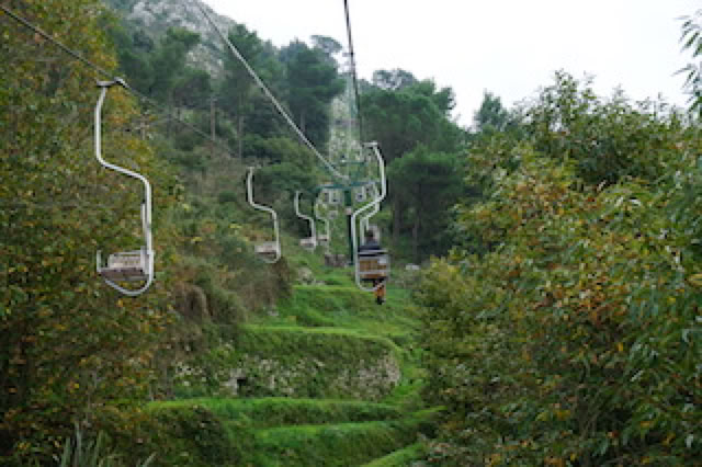Les guides conseillent aussi Anacapri, au dessus de Capri, qui permet ensuite d'accéder au "Monte Solaro" via un télésiège. C'est donc avec un petit bus public orange que nous montons à Anacapri, par une route sinueuse et très spectaculaire, voire vertigineuse. Il est déjà 13h30 et nous avons une petite faim. Nous trouvons une excellente part de pizza à emporter que nous mangeons sur un banc suivi d'un café en terrasse. Puis nous trouvons le fameux télésiège … monoplace ! Nous prenons un A/R avant d'embarquer sur ces "chaises suspendues" : un peu impressionnant, mais somme toute, ce n'est qu'un télésiège. En haut, peu de monde, à part toute une famille indienne un peu bruyante. La vue est magnifique, les falaises vraiment vertigineuses … et le soleil fait une opportune apparition et fait enfin scintiller la Méditerranée. Après quelques selfies, Pierre se demande si on ne pourrait pas descendre à pied … mais avec un dernier bateau à 16h30, il ne faut pas se louper. Renseignement pris, on prend donc à pied le chemin de la descente (tant pis pour les billets retour du télésiège). C'est finalement très simple et permet de profiter un peu du paysage et de la nature environnante.