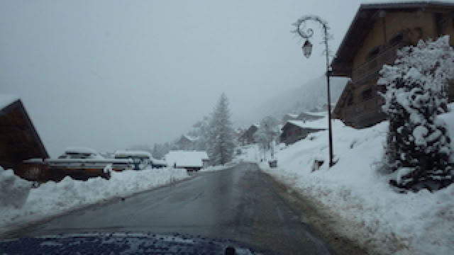 Après un bon petit-déjeuner, un peu de farniente, il faut quand même aller faire les courses pour la semaine ! La Mini affronte vaillamment la neige devant le garage et les pneus neige font merveille sur la route enneigée … même pas peur, Pierre. Grosses courses à Intermarché, retour, un bon déjeuner, etc.