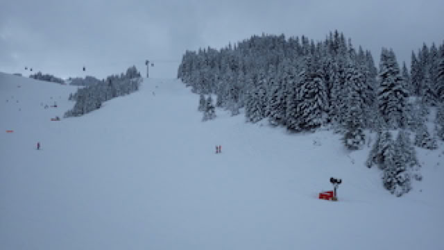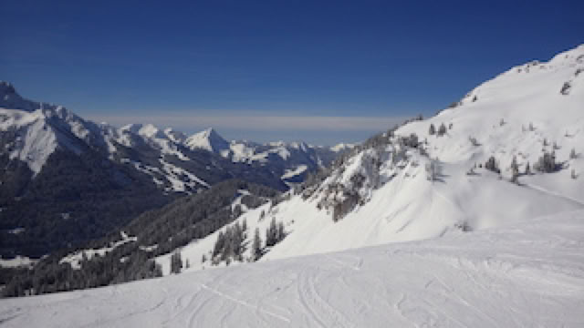Redescente sur Torgon puis retour vers Super Châtel. On tente la rouge du Morclan: un peu abrupte pour moi mais ça passe sans casser ... Puis bascule vers le Linga : nous descendons sur le lac de Vonnes par la piste bleue … pas terrible. Une montée à la tête du Linga puis descente... vers la liaison Super Chatel, car la piste principale du Linga est fermée, réservée aux compétitions. Bref, on ne reste pas longtemps au Linga, mais nous aurons vraiment profité ce matin du domaine de La Chapelle et de Torgon, moins fréquenté et pourtant superbe.