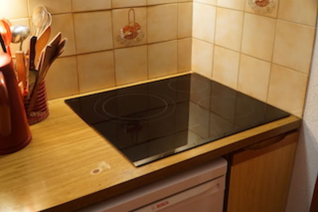 En fin d'après-midi, on se lance dans le remplacement des anciennes plaques de cuisson par une nouvelle plaque vitrocéramique achetée à Courbevoie pour l'occasion. Le simple remplacement se transforme logiquement en une grosse séance de bricolage : agrandissement de l'ouverture, ajustement de la hauteur du meuble en dessous pour permettre l'encastrement, branchement, ajustement, finition, découpe de la plinthe, etc. Mais le résultat est magnifique ! Chauffage instantanée, facilité de nettoyage (ah zut, il manque du VitroClen … )