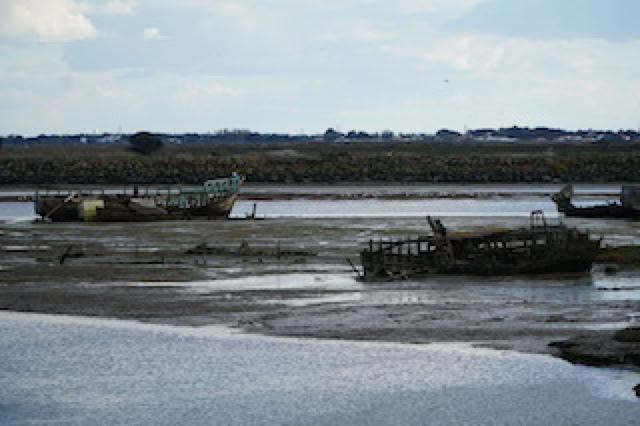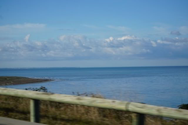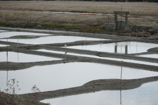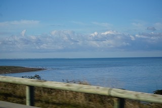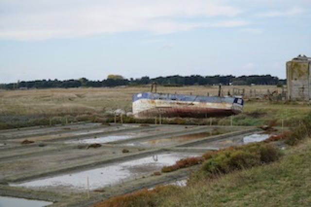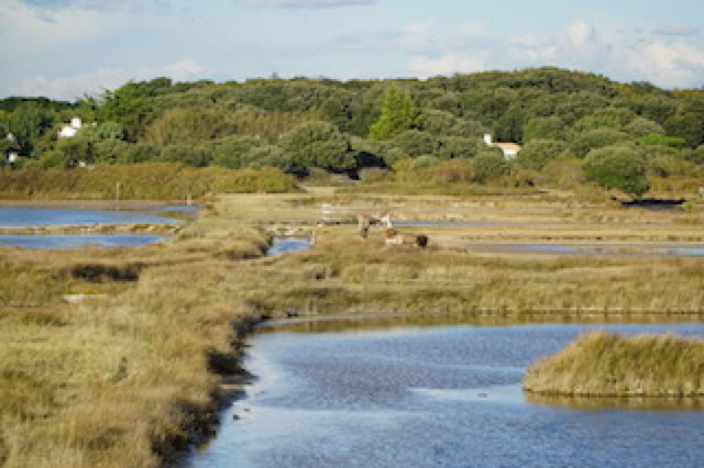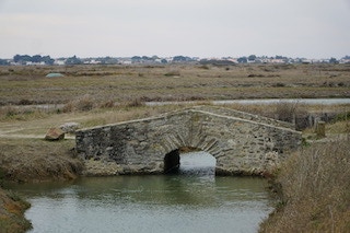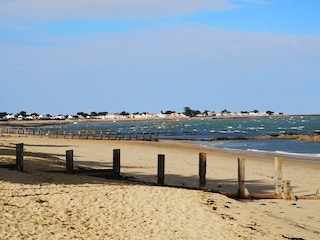 Le matin, boucle dans le Nord de l’île : d’abord le long de la jetée Jacobsen jusqu’à la pointe nord, pour la route qui longe la côte Est jusqu’au bois de la Chaise (ou Chaize). A intervalle régulier, une allée permet d’aller jusqu’au bord de mer, avec à chaque fois un point de vue différent, une belle plage ou un petit coin tranquille. C’est aussi la découverte de belles maisons cachées dans cette forêt ou bien bordant la plage. Une maison en particulier ferait bien notre affaire et nous fait penser à celle que nous louons habituellement à Arcachon: étroite avec un garage en rez-de-chaussée et un escalier latéral, sur un beau terrain … On peut rêver … Un peu plus loin, c’est un joli village blanc, Le Grand Vieil, avec des maisons basses aux tuiles rondes et aux volets bleus. Petite pause pour acheter du ... dentifrice dans un Spar, et pour prendre un café et se réchauffer un peu. Nous poursuivons la route, avec une pause dans un joli cimetière marin du lieu-dit de l’Herbaudière. Nous terminons la boucle Nord en longeant les marais salants. Distance totale : 20 km.