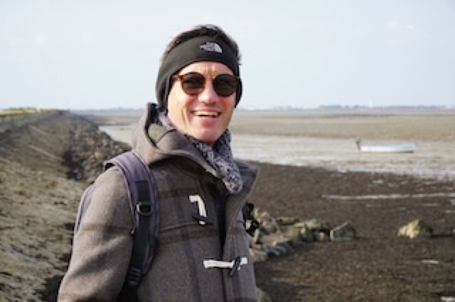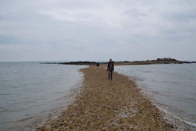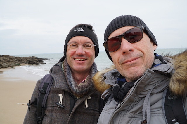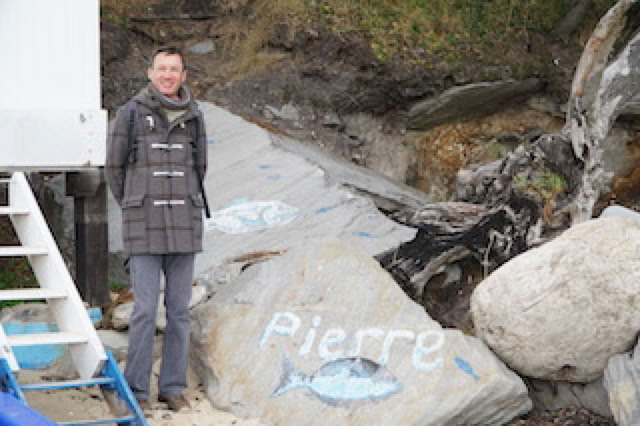 Malgré le froid (on est super bien couverts) nous découvrons plein d’endroits sauvages, à cette saison. Nous adorons toutes ces belles maisons de style balnéaire qui donnent envie de s’installer sur leur terrasse dans une chaise longue et de regarder la mer pendant des heures, On voudrait aussi partager ces grandes maisons avec toute la famille. Pour aujourd’hui, nous nous contenterons de longer ces grandes plages. Pierre en profite pour faire une « choré » que je filme et qu’il poste sur Facebook pour ses ami(e)s du sport. Nous tombons aussi sur un rocher peint avec un gros poisson (une Morue ou un Thon ???) et le prénom « Pierre » au dessus. Photo obligatoire ! Nous nous engageons sur un passage à découvert qui mène à un petit îlot recouvert de moules et d’huîtres sauvages, que des pêcheurs à pied tentent de décrocher de leurs rochers. Pierre s’inquiète que la marée recouvre le passage … mais en fait, la mer descend encore : ouf, sauvé des eaux :-) !
