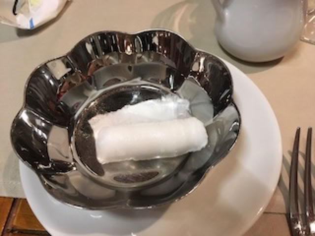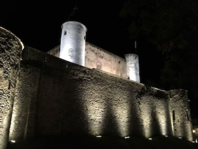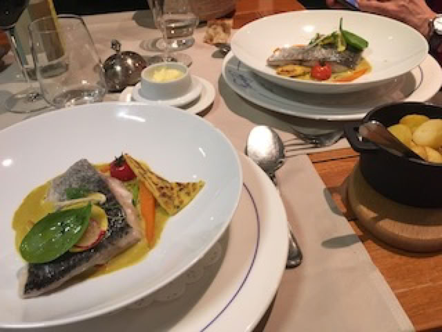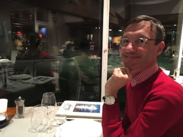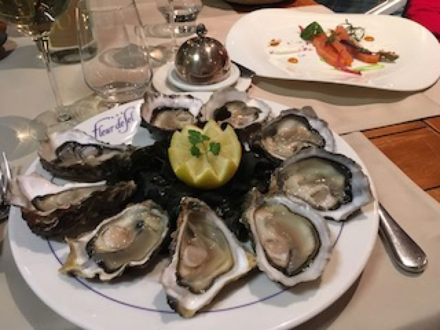 Vient l’angoisse du restaurant, un lundi soir, encore plus désert que le dimanche soir. Heureusement, l’hôtel-restaurant « Fleur de Sel » nous paraît très bien et nous réservons nos deux couverts. Mais c’est à un 1 km du centre et c’est à pied et dans le noir que nous y allons … Belle salle, avec de la place, très calme, service soigné et attentif : j’aime. Et surtout, je peux avoir des huîtres au menu : je ne serai pas reparti de Noirmoutier sans manger quelques huîtres. A noter un rince-doigts « magique » : une sorte de gros comprimé d’aspirine effervescent, sur lequel on verse de l’eau chaude … et qui se transforme en … lingette humide. Amusant. Sinon, très bonne cuisine, en juste quantité et bien présentée, le tout accompagné de verres de vin de Gascogne. Bref, il nous fallait bien ça pour terminer le séjour en beauté :-). Et Pierre me prend en photo dans mon magnifique pull Lacoste (rolling joke …). Reste le retour à pied après manger : finalement pas désagréable pour profiter une dernière fois de Noirmoutier.