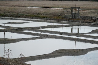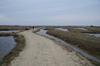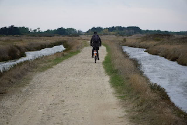 Et c’est reparti pour une deuxième grande boucle à vélo, vers le Sud cette fois. C’est un tout autre paysage, de plaine avec des champs de pommes de terre et des marais salants. Au début, nous avons un fort vent dans le dos: nous n’avons même pas un souffle de vent relatif sur le visage ! A l’Est de l’île, nous arrivons dans un port ostréicole, Le Bonhomme, protégé par une digue, au bout d’une longue ligne droite. Le vent de face est si puissant que nous n’arrivons à pédaler jusqu’en haut de la digue ! Ça décoiffe grave :-) mais le paysage ostréïcole est très beau. Nous rejoignons ensuite l’Ouest de l’île en traversant la Guérinière à l’abris du vent et c’est tant mieux.Mais suite à une petite erreur de guidage, nous nous retrouvons cette fois à remonter le côté Ouest, face au vent du Nord. C’est vraiment dur d’avancer, surtout pour s’apercevoir au bout de la route que c’est un cul de sac et que ce n’est pas le chemin pour revenir. Nous rebroussons chemin et finissons par trouver l’entrée du chemin qui traverse les marais salants. Le jour commence à tomber et c’est une impression un peu curieuse de se trouver au milieu de ce dédale de marais et de canaux … surtout quand nous entendons quelques coups de fusils aux alentours. Bon, difficile de nous confondre avec des bécasses, quoique qu’il existe bien des chasseurs qui confondent faisans et surfeurs … Mais finalement, en suivant le chemin pris par un scooter qui passait par là, nous retournons finalement sans encombre et vivants à Noirmoutier, après 23 km cette fois.