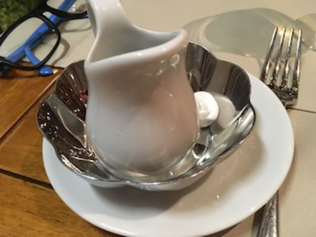 Repas à la table d’hôte The Corner, dans la très belle salle à manger, où le feu de bois dans la cheminée ajoute à la chaleur de la décoration. Potage de «pumkin» (potiron), noix de Saint-Jacques, filet de bar et pana cota aux framboise, le tout largement arrosé par Diane d’un pinot gris de Loire.