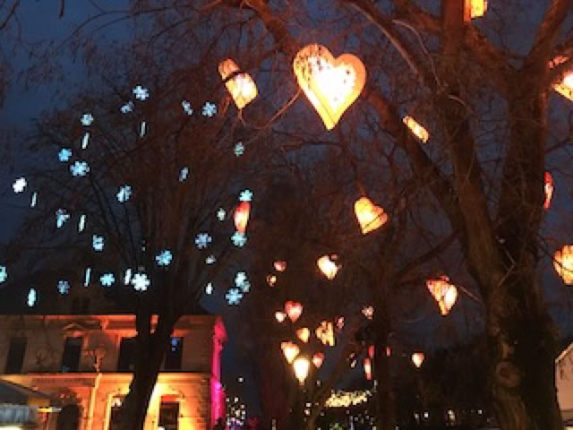 Journée tranquille et cette fois, ensoleillée. Les clétiens repartent en début d’après-midi. Ensuite, Josiane, Pierre et moi emmenons G. à Metz pour profiter de la patinoire. Pendant une demi-heure, Pierre et G. vont tourner ainsi sur la patinoire, d’abord très prudemment. Puis G. osera faire deux ou trois tours seule, sans tenir la main de Pierre. Après la patinoire, nous traversons les rues commerçantes animées pour rejoindre le « Sentier des lanternes » au bord de la Moselle, dominée par la belle cathédrale de Metz très joliment éclairée. Ce parcours sous les lampions et bordé de personnages lumineux est vraiment un plaisir pour les yeux, encore plus pour les enfants. Puis retour à Mance où Pierre nous préparera une excellente soupe pommes de terre, carottes, lentilles et lardons. Parfaite pour finir sainement ce copieux week-end. Heureusement, il reste un peu de soupe de cerises ! Soirée Mary Poppins à l’étage, mais la petite G. s’endormira au milieu. En bas, Bernard et moi regardons Sayonara (non, pas une seule scène de combats aériens … décevant !)