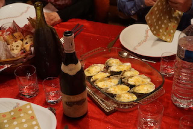 Apéro traditionnel avec les toasts au pâté maison, le foie gras maison et du Champagne sans beaucoup de modération ! C’est la jeune G. qui fera cette année la distribution des cadeaux, le Père Noël s’étant trahi l’année précédente par son excès de minceur … Et c’est vers 21h50 que nous passons à table pour le diner du réveillon. Huîtres (ouvertes d’une main experte par Xavier), confit de canard … et surtout, la ribambelle des desserts : LA soupe de cerises, les îles flottantes, les oeufs au lait, les tartes … Mon moment préféré ! 😀 Comme d’habitude, les conversations sont … animées et parfois bruyantes, les jeunes en bout de table étant finalement beaucoup plus tranquilles !