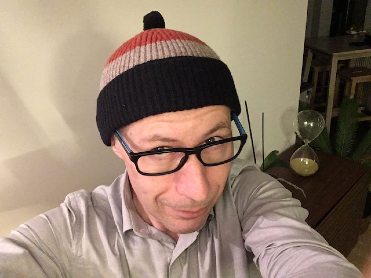 Et après la journée de travail, petit resto à Paris avec Pierre (qui ne revient pas de Clermont-Ferrand …) et Julien. Il pleut, il fait froid et nous nous retrouvons au Zimmer près de Châtelet, normalement une bonne brasserie parisienne, cossue. On s’installe … et le serveur nous annonce froidement que la cuisine ne fait pas de chaud ce soir suite à un problème d’infiltrations. Pas très envie de passer la soirée devant une salade et nous migrons vers la brasserie d’en face, le Sarah Bernhardt. Moins classe et un peu vieillotte (elle ferme bientôt pour travaux …). Mais la nappe vichy en papier et la cuisine basique n’empêchent pas que nous passions en très bon moment avec Pierre et Julien. Julien m’offre le « Petit manuel d’Economie Quotidienne » de Dominique Seux … et un charmant bonnet à pompon. Certains ont une tête à chapeau, je pense que j’ai plutôt une tête à bonnet ! 😀