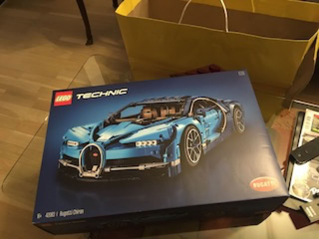 Ce matin, après ma douche et un rapide rasage, j’arrive dans le séjour pour un rapide petit-déjeuner (tout est rapide le matin …) et, Oh heureuse surprise, sur la table basse trône un ENORME sac jaune vif Lego où je devine immédiatement LA boîte ultime, la Bugatti Chiron en Lego Technic : de folles soirées Lego en perspective : Merci beaucoup Pierre 😘
