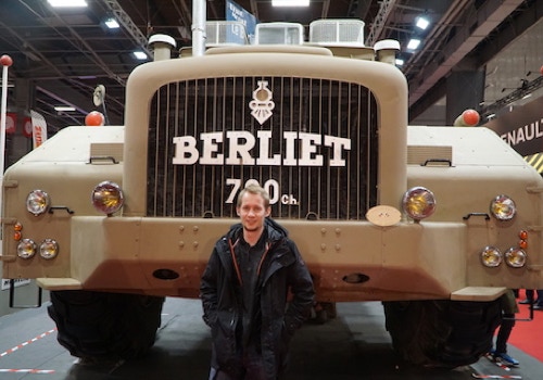 Je reçois un SMS de Pascal Hamon, un autre collègue (mon ancien chef à vrai dire, celui qui m’a recruté à la SG à l’origine), qui me dit qu’il est là. Sans surprise pour un véritable passionné et restaurateur de Citroën, c’est sur le stand des 100 ans de Citroën que nous nous retrouvons. Il est avec sa compagne Valérie que j’avais déjà rencontrée à la soirée théâtre d’Axelle Besson. Pascal me détaille en particulier la 5HP rouge sur le stand, puisqu’il participera en juillet à la manifestation des 100 ans de Citroën avec une 5HP … jaune. Je prends Pascal et Valérie en photo au pied du gigantesque Berliet qui est exposé.