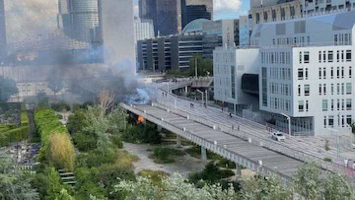 Fin mai, la passerelle Chemetov a un sérieux coup de chaud. Pour une raison qui reste à expliquer, la cabane et tout le bric à brac du SDF qui vivait sous la passerelle a pris feu. Le feu est violent car c’est une véritable maisonnette qu’il s’était construit … il y avait même une bouteille de gaz visible après l’incendie, qui heureusement n’a pas explosé. Quant aux pompier, il s’est passé plus d’1/2 heure entre le signalement et le début d’arrosage. Entre autres, ils n’ont pas pu faire abaisser les bornes des accès … pompier. Et évidemment, le feu sous la passerelle s’est propagé au platelage de la passerelle, créant un trou … qui a mon avis va rester là un bon moment …