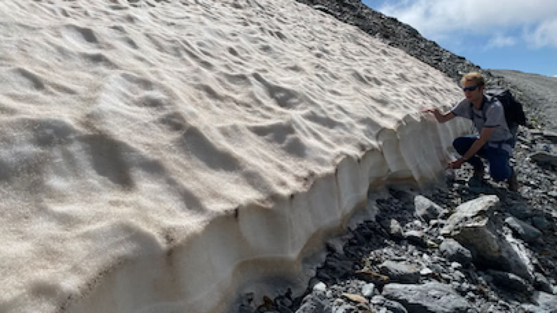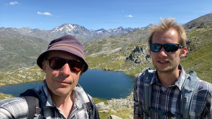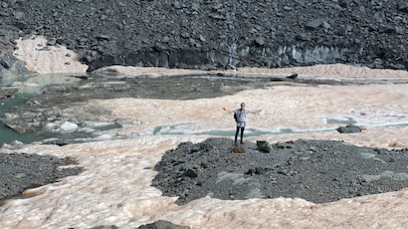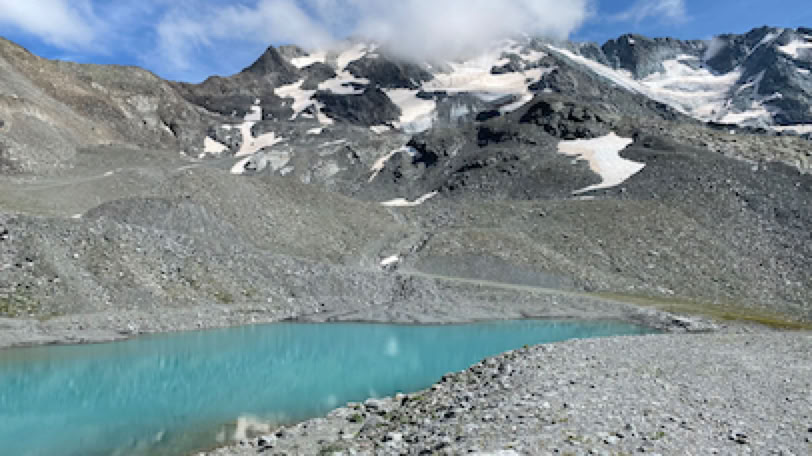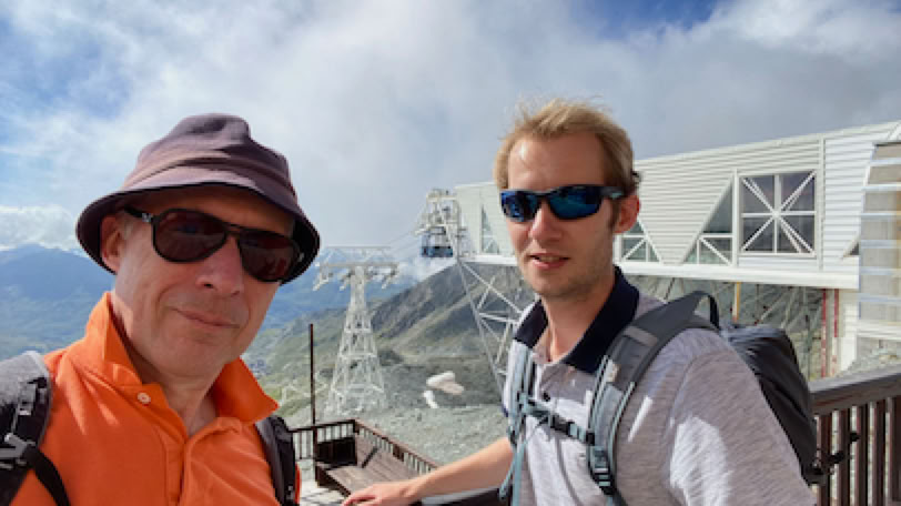Après une (grasse) matinée bien tranquille, nous entamons notre habituelle randonnée d’échauffement : montée au Lac des Grenouilles, montée régulière jusqu’au lac Blanc, petite pause Pim’s, puis poursuite de la montée jusqu’au Péclet. Réchauffement ou simplement séjour fin-Août par rapport à l’année dernière, mais la neige a disparu du chemin, l’épaisseur de neige sur le côté du chemin à fortement diminué, et surtout, au pied du glacier, les rochers et l’eau ont largement remplacé la glace. Le glacier lui-même semble avoir encore reculé. Néanmoins, le paysage à presque 3000m est toujours aussi impressionnant, et Matthieu fait voler son drone. C’est toujours très impressionnant et stressant de voir ce petit bijou de technologie quasiment disparaitre de la vue et monter aussi haut, mais ça fait des images extraordinaires.