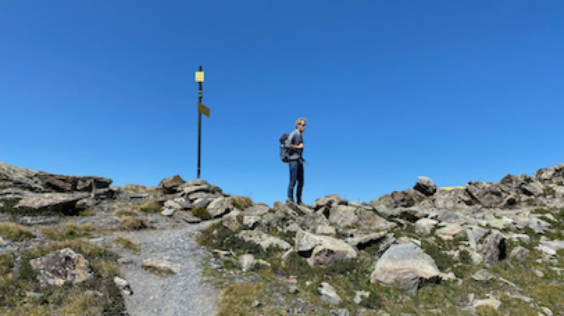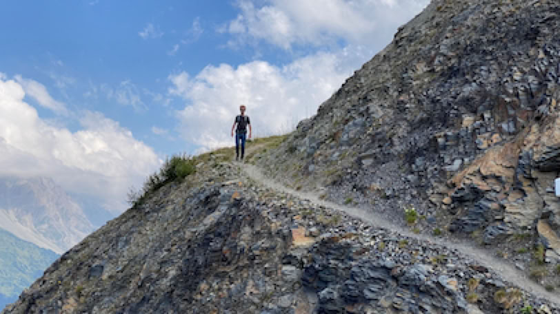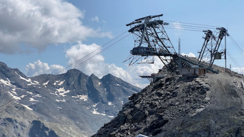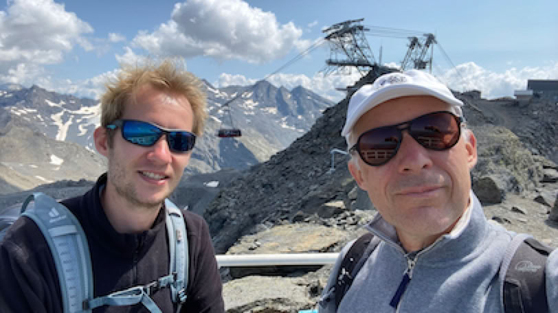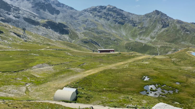 Après la longue distance de la veille et en prévision de la méga-rando prévue le lendemain, nous prévoyons un programme tranquille. Nous montons donc par les télécabines et téléphérique à la Cime Caron. Il fait très beau et le panorama toujours aussi spectaculaire, tout comme la structure du téléphérique littéralement tenue par les câbles. J’aimerai bien une fois descendre de la Cime Caron à pied, par la piste 4x4, mais Matthieu juge plus prudent de redescendre par la benne pour se préserver pour le lendemain. Arrivé en bas, nous prenons néanmoins le télésiège de Moutière pour profiter d’une dernière remontée mécanique et faire une descente tranquille à pied sur Val-Tho. En haut de Moutière, nous (re)découvrons l’altisurface, fidèlement reproduite sur Flight-Simulator 2020 :) Nous profitons aussi de quelques chaises longues pour savourer le paysage, le soleil, et quelque Pim’s avant de redescendre. Nous croiserons à nouveau une marmotte dans la rocaille qui se laissera approcher.