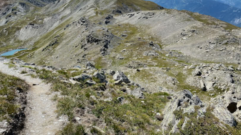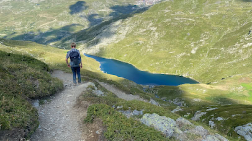 Nous entamons la descente vers Val-Thorens par un très beau chemin, un peu raide, passant par le lac de Montaulever.