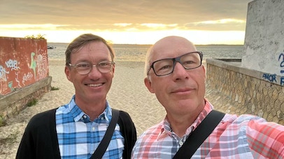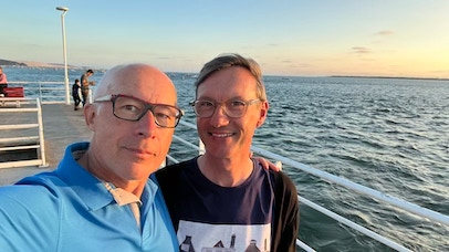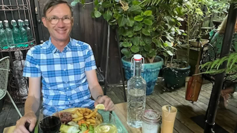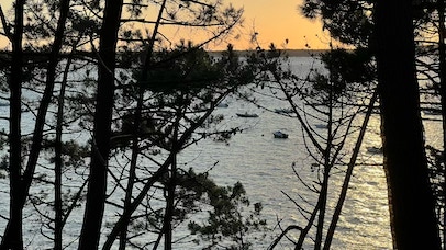 Jour bonus donc ! Lever tardif, mais Pierre n’est pas en grande forme avec un mal de tête naissant. Nous allons juste faire quelques emplettes à l’épicerie la plus proche pour avoir de quoi manger ce midi avec une bonne salade de tomate - féta. Puis pendant que Pierre se repose, je vais faire un rapide tour à vélo, histoire de monter quelques côtes (celle du Golf). Vers 17h, nous allons rendre les vélos au Moulleau, passons un moment sur la plage du Moulleau, je nage un peu à contre-courant. Aller-retour à pied jusqu’à la maison pour se faire propres, et à 19h45, nous arrivons au restaurant «Le Jardin». Bon dîner sous les arbres que nous terminons par des généreux canelés-façon-profiterolles, que Pierre et moi partageons avec deux cuillères. Dernière petite promenade vespérale au Moulleau avant le retour à la maison.