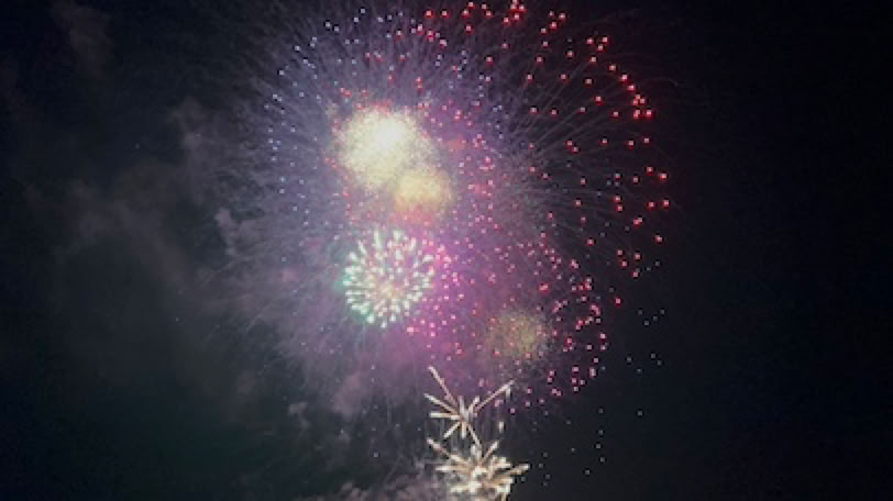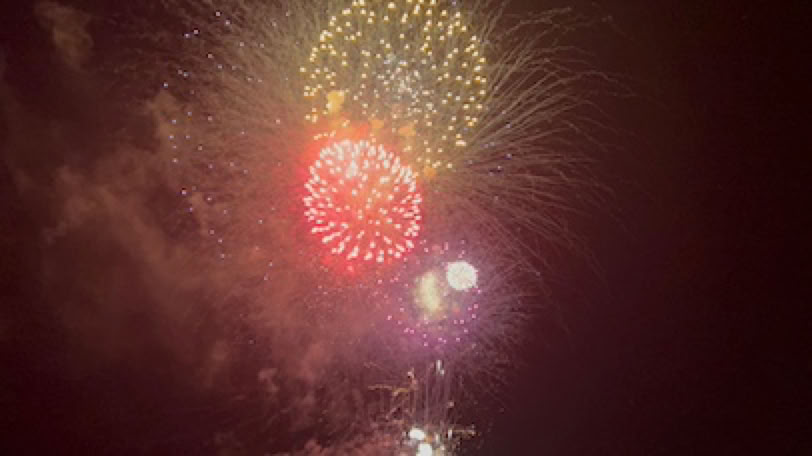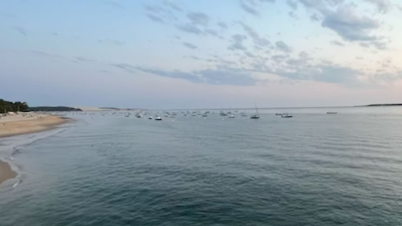 L’air est doux, les lumières vertes et rouges des bateaux dansent devant la plage. Au loin nous voyons les feux d’artifice des autres communes du Bassin et enfin, à 23h les lumières de la digue s’éteignent et le feu d’artifice commence sur quelques «bombes» très puissantes. Pendant près de 20´, nous profitons du spectacle qui se termine par un bouquet final vraiment exceptionnel et magnifique. Retour rapide à vélo après cette journée assez tranquille.