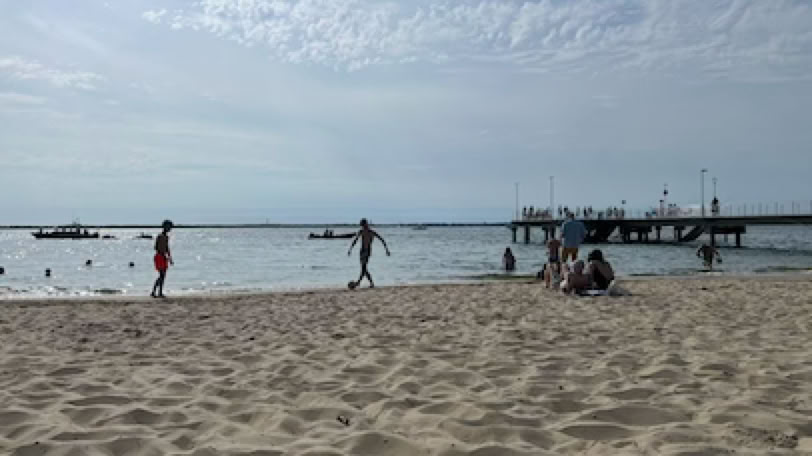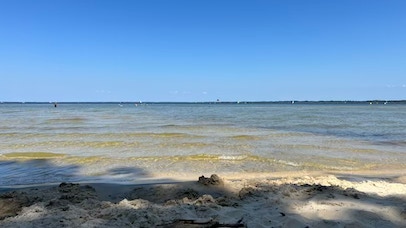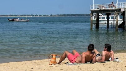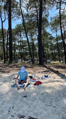 Début de journée très similaire à la précédente : petit-déjeuner vers 10:30, café au Moulleau et fin de matinée sur la plage, à côté de la jetée du Moulleau. Première séance de natation de la journée.