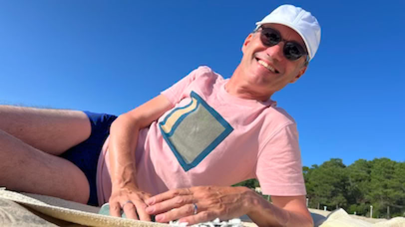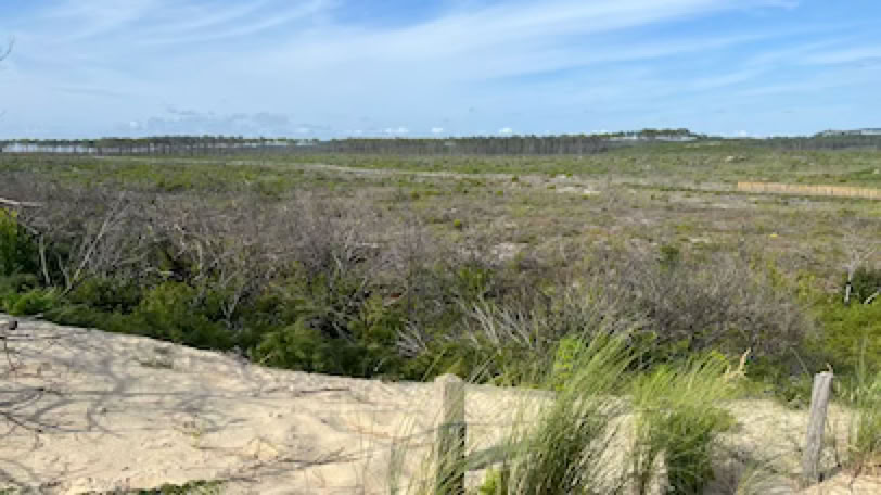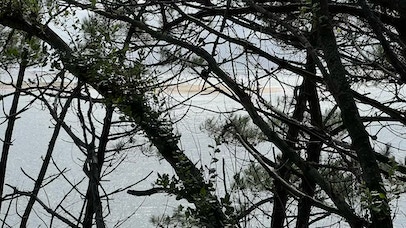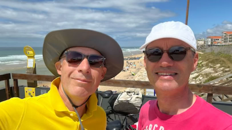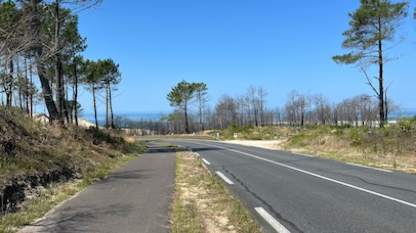 Réveil (un peu) plus tôt. Après un rapide petit-déjeuner, direction le Moulleau pour aller échanger mon vélo. C’est rapidement fait et nous allons prendre notre café allongé à «L’Oubli» en regardant passer les voitures. Comme il fait beau, nous allons nous installer sur la plage, à gauche de la jetée. Pierre lit pendant que je fais quelques longueurs dans la mer un peu agitée. Retour à la maison en fin de matinée, déjeuner avec une bonne salade de riz préparée par Pierre et … repos ! A 16h, nous décidons d’aller à vélo vers les plages de l’Océan. C’est la première fois que nous y retournons depuis les terribles incendies de 2022. Et malheureusement, le spectacle est bien au-delà de nos pires craintes. Il n’y a simplement plus de forêts entre le site du Pyla et les plages de l’océan 7 km plus au Sud. Des campings ont disparus. Le fameux camping des Flots Bleus est certes là mais avec des mobiles homes neufs, sans arbres autour. La dune, qui était jusque là masquée par la forêt, apparaît sans obstacle. La route et la piste cyclable serpentent au milieu d’une sorte de steppe. S’il n’y avait pas les côtes et les descentes que nous connaissons bien sur la piste cyclable, nous ne saurions pas dire précisément où nous nous situons. C’est terriblement déroutant. Nous arrivons néanmoins à la plage de la Salie Nord pour une courte pause sur la plage. J’en profite pour jouer avec les grosses vagues de l’Océan, dans la zone surveillée ! Retour et, dans la grosse montée de la «Maison Blanche» (une boîte de nuit … brûlée elle aussi), j’ai de nouveau ma chaîne qui saute, mais qui ne casse pas cette fois ci. Un peu compliquée à remettre … et j’ai les mains complètement noire de cambouis après ça. Sinon, fin du trajet normale.