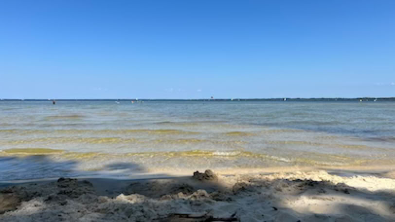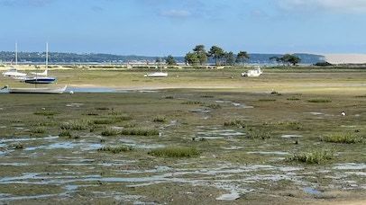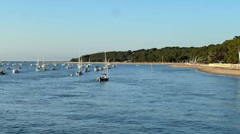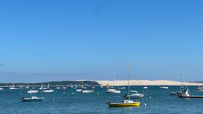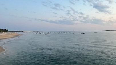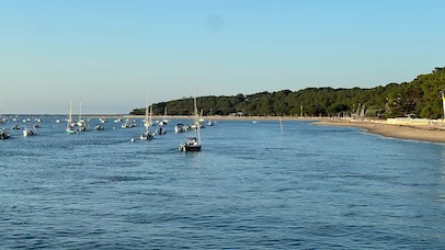 Retour à la maison, et nous prenons la Mini pour un supplément de courses rapidement exécuté, à la Teste. Déjeuner avec un excellent melon et une non moins excellente salade de tomates. Repos … et départ vers la plage Pereire un peu avant 17h. L’avantage dans ce cas, c’est que je ne mets pas de crème solaire. Re-séance de natation, profitant que la mer est presque haute, c’est plus pratique. Un peu de mots fléchés, de Duolingo pour apprendre l’italien, je passe quelques coups de fil à la famille. Pendant ce temps, Pierre lit et va quand même faire une petite balade les pieds dans l’eau. Retour et dîner simple avec un bon steak de thon rouge, pommes de terre, salade. Enfin, nous prenons nos vélos pour un tour vers le port de plaisance d’Arcachon. L’air est calme et tiède, c’est bien agréable et beaucoup moins tempétueux que lors de notre séjour à l’automne 2023 en pleine tempête au même endroit.