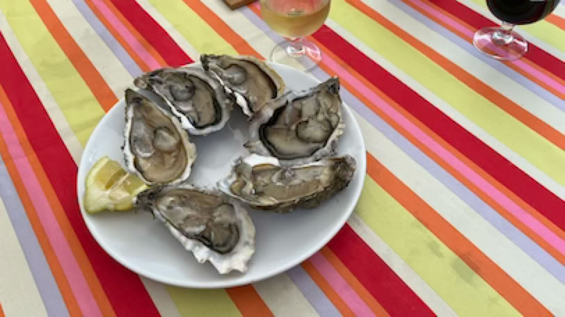 Retour rapide à la maison, déjeuner, repos, sieste … Nous reprenons nos vélo pour un tour au Pyla. Tout au bout, le quartier de la Corniche, avec sa vue sur le Bassin et ses somptueuses maisons d’architecte, impressionne toujours. Histoire de faire un peu plus de vélo, nous retournons par le site de la Dune du Pyla (sans s’y arrêter) et la Teste de Buch. Et presque à la fin, juste dans une petite montée, ma chaîne de vélo casse lors d’un changement de vitesse. C’est donc en utilisant mon vélo comme une draisienne et en profitant des descentes que je rejoins la maison. Pierre a pris de l’avance pour préparer le repas. En apéritif, je me prépare mes six énormes huitres qui seront parfaites avec mon verre de Côte de Blaye blanc bien frais. Pour le diner Pierre avait préparé du poisson avec une ratatouille.